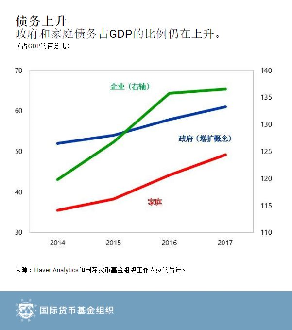 3. 信贷增长已经放缓,但仍然过快。 虽然名义GDP和工业利润大幅回升,但2017年非金融部门债务总额的增长速度仍大大快于名义GDP。尽管企业债务占GDP的比例已经稳定下来,但由于预算外投资支出继续保持强劲,住房抵押贷款和消费信贷迅速增加,政府尤其是家庭债务正在上升。可能需要在较长一段时间内采取坚决的措施,解决根本的脆弱性问题。
