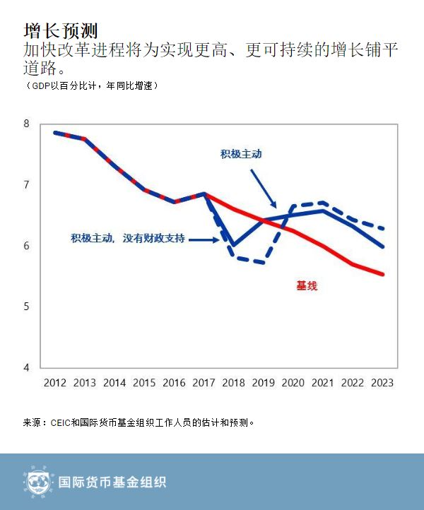 6. 加快改革的好处。 在基线预测中,实际GDP在2018年将增长6.6%,反映了收紧监管措施收紧的滞后效应以及外部需求减弱。风险偏于下行,全球金融市场条件可能收紧,贸易紧张局势可能加剧。如果当局现在更加果断地化解政策矛盾,侧重于提高经济增长的质量以及加强市场力量的作用,那么近期增长将减弱,但长期增长会更加强劲、更可持续。在一个示意性的“积极主动”情景中,改革取得更快进展,特别是国有企业改革和解决“僵尸”企业问题,这也能加快从投资到消费的再平衡进程。如果面临增长急剧减缓的风险,那么应实施临时性的一揽子财政刺激措施,并调动资源支持再平衡调整,这有助于缓解近期的不利影响。