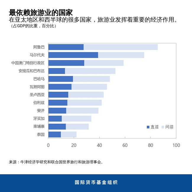 对于 亚太地区和西半球 的许多发展中国家——尤其是小型岛国,旅客人数锐减的影响相当严重。在疫情暴发前,旅游业体量很大,占到全球GDP的10%以上。在依赖旅游业的国家,这一比重甚至更高。