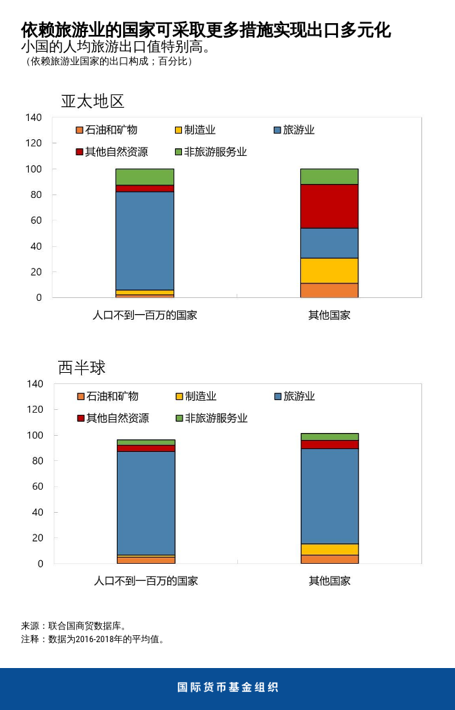 最后,如果游客偏好改变或经济受到长期创伤,导致旅行减少的现象持续更长时间,一些依赖旅游业的国家可能需要踏上漫长艰难的转型之路,力争实现经济的多元化发展。投资非旅游行业是一个长期目标,但加强旅游业与当地农业、制造业和娱乐业之间的联系能为此提供帮助。例如在牙买加,当局推出了一个在线平台,允许酒店行业的买家直接从当地农户那里购买商品。此外,可通过达成区域协定来解决经济规模效应有限的制约因素,以扩大出口(包括服务出口)。