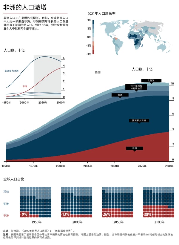 联合国预计,到2050年,非洲人口将接近25亿。这一数字表明,届时全球超过25%的人口都将是非洲人。此后,非洲的人口增速将会放缓,但仍将是世界人口增长最主要的来源:到本世纪末,非洲占世界人口的比例将接近40%。