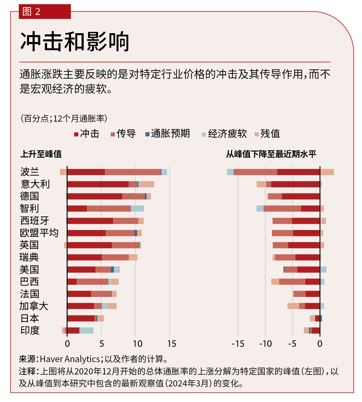 综合考虑各种因素,我们估计了总体冲击、它们向核心通胀的传导、更广泛的宏观经济疲软衡量指标以及长期预期的变化这些因素对各国通胀涨跌的贡献。