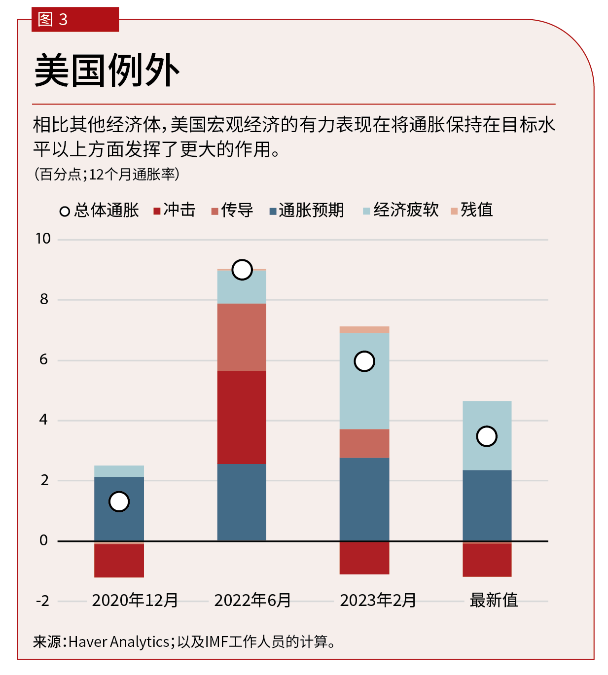 美国是一个明显的例外。尽管自2023年初以来劳动力市场大幅降温,但广泛的宏观经济紧缩对通胀的贡献仍然大于其他经济体。自2023年2月以来,美国总体通胀率的下降同时反映了整体经济的降温和早先总体冲击传导作用的减弱(见图3)。