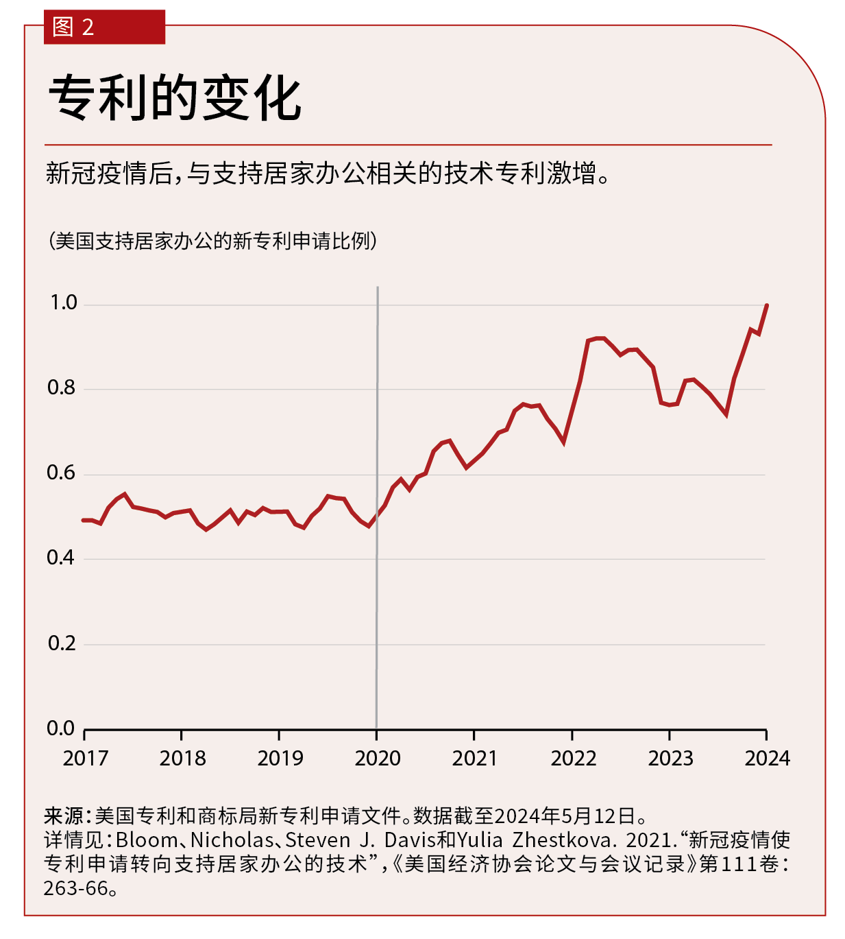这种反馈循环已经开始了。在美国专利商标局,使用“远程办公”、“居家办公”或类似词汇的新专利申请的比重在2020年之前一直是稳定的,但在之后则开始上升(见图2)。这凸显出了技术的改进。更好的摄像头、屏幕和软件,以及诸如增强现实、虚拟现实和全息技术等技术,将在未来提高混合和远程办公模式的生产率。这将在经济增长和居家办公之间产生一种正向的反馈循环。