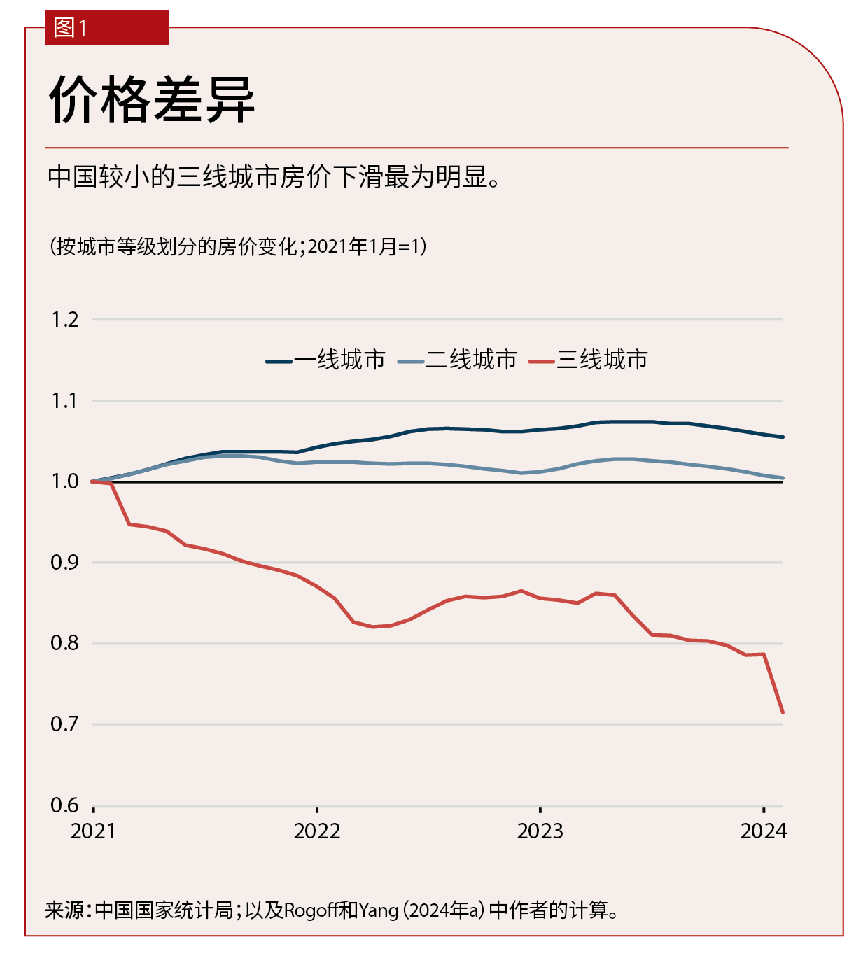 如图1所示,我们通过计算可以比较过去几年中国不同城市组房价的演变情况。其中,一线城市包括北京、深圳、广州和上海,二线城市为省会和直辖市,三线城市则为较小且通常较贫穷的城市。