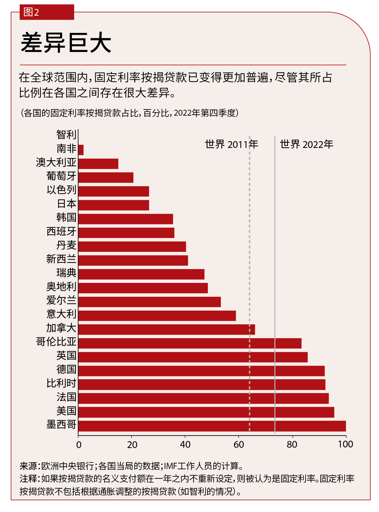 我们的研究表明,一些关键特征在不同国家的差异很大。例如,南非的未偿固定利率按揭贷款所占比重接近于零,而墨西哥或美国则达到95%以上(图2)。