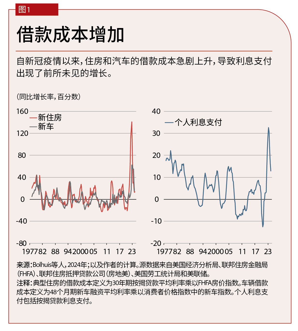 对于消费者来说,货币成本是生活成本的一部分。因此,随着利率在2023年下半年跃升至20年来的高点,消费者感受到了财务压力。美国的房价仍比疫情开始时高出50%以上,按揭贷款利率则大约上升了一倍。平均而言,新的30年期按揭贷款的利息支付额是2019年底的近三倍。新车贷款的利息支付额几乎翻了一番。因此,2023年家庭的利息支付额增长了约30%,是有记录以来的最快增速(见图1)。