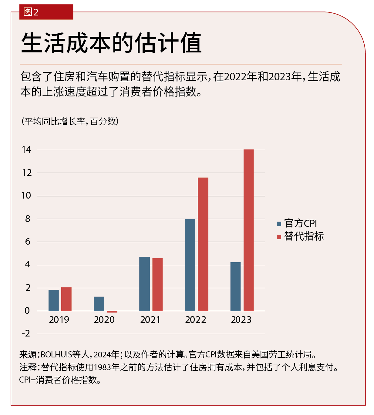 最后,我们提出了明确包含货币成本的生活成本替代衡量指标。美国劳工统计局目前的方法仅依靠租赁市场来解释房主等效租金的变化(Bolhuis、Cramer和Summers,2022年)。1983年之前,CPI包括一项住房拥有成本的衡量指标,其反映了按揭贷款利率和住房价格。同样,官方统计数据不包括汽车的借款成本以及其他个人利息支付(例如信用卡债务),这些成本更能反映消费者承担的实际成本。