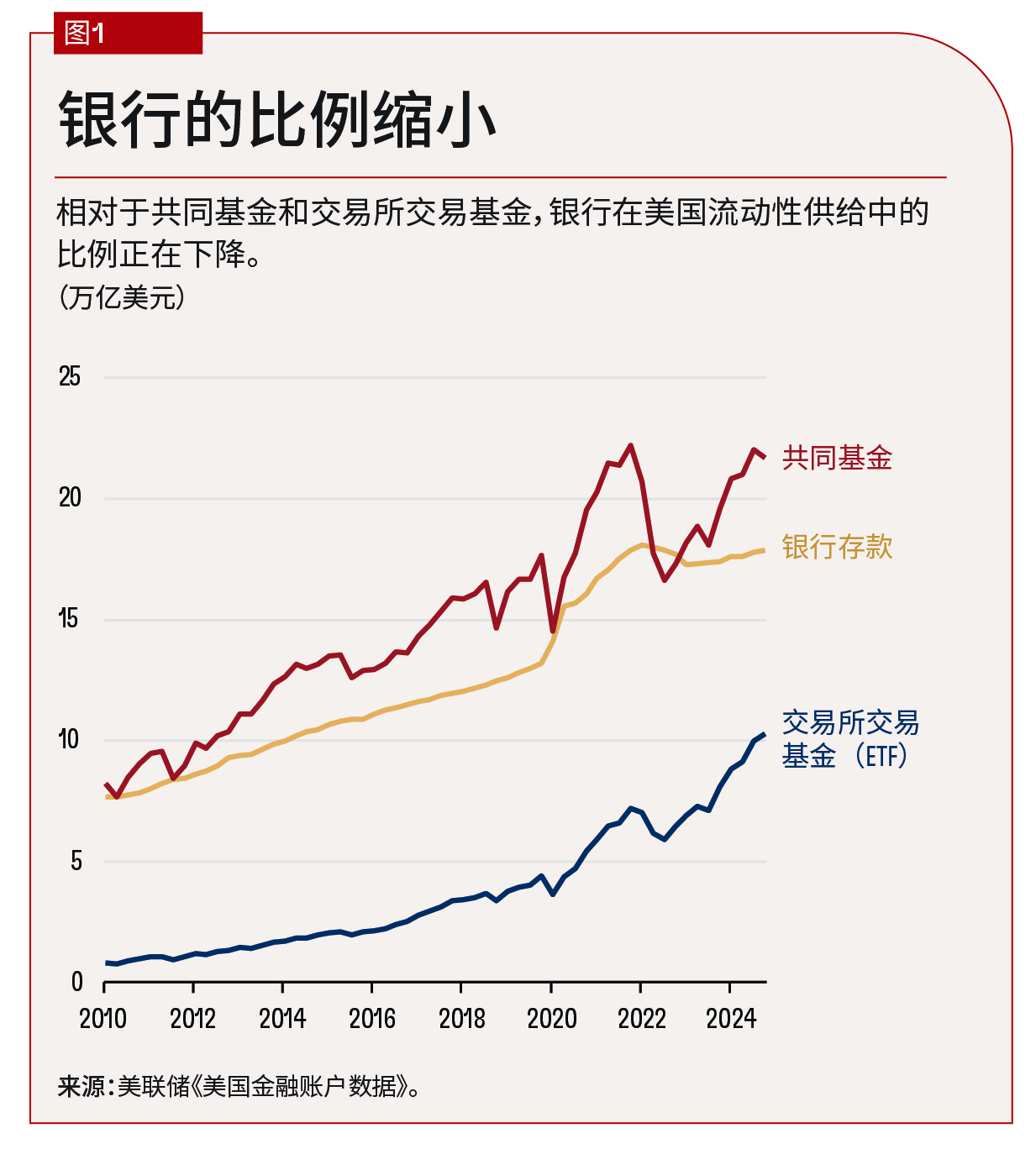 银行曾是金融市场创造流动性的主角。然而如今,在系统中为家庭和投资者提供日常流动性的比例日益增加的并非银行,而是非银行资产管理基金(图1)。开放式共同基金和交易所交易型基金(ETF基金)允许投资者随时赎回资金,尽管这些基金持有的公司债券等资产绝非流动性资产。它们承诺提供每日流动性,但是持有的基础资产却无法随时变现——这与银行的做法如出一辙,可是它们既没有存款保险、资本缓冲,又无法获得央行流动性支持。