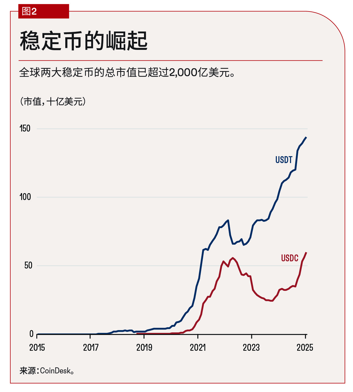 作为比特币的近亲,稳定币应运而生,旨在解决这些问题(图2)。与比特币类似,稳定币是旨在提供支付服务的区块链资产。美国“GENIUS”法和“STABLE”法等新立法可能进一步推动其发展。稳定币与比特币的重要区别在于,稳定币与现实世界中的货币(通常是美元)挂钩。发行方——如Circle(USDC)和Tether(USDT)——通过持有银行存款、国债及公司债券等储备资产维持锚定。与比特币的剧烈波动不同,稳定币正展现出成为低成本、无国界支付替代方案的潜力。在阿根廷、土耳其和委内瑞拉等通胀高企的国家,稳定币已成为民众储蓄、跨境汇款及交易结算的命脉。随着大型银行和商业巨头考虑发行他们自己的稳定币,这类资产正稳步进入主流支付体系。