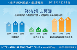 - 亚洲新兴和发展中经济体将保持强劲增长,2018-2019年的增长率预计为6.5%。在中国,随着金融部门监管收紧措施产生效果、外部需求减弱,预计增长率将从2017年的6.9%下降到2018年的6.6%,2019年将进一步降至6.4%。在印度,随着换钞措施以及商品和服务税实施带来的不利影响消退,预计增长率将从2017年6.7%上升到2018年的7.3%,2019年将进一步升至7.5%。当前的2018年和2019年增长预测分别比4月《世界经济展望》预测低0.1个百分点和0.3个百分点,原因是石油价格上涨对国内需求造成不利影响,以及预期通胀上升导致货币政策的收紧步伐快于预期。东盟五国的国内需求保持稳健,出口继续恢复,因此 ,增长率预计将稳定在5.3%左右的水平。