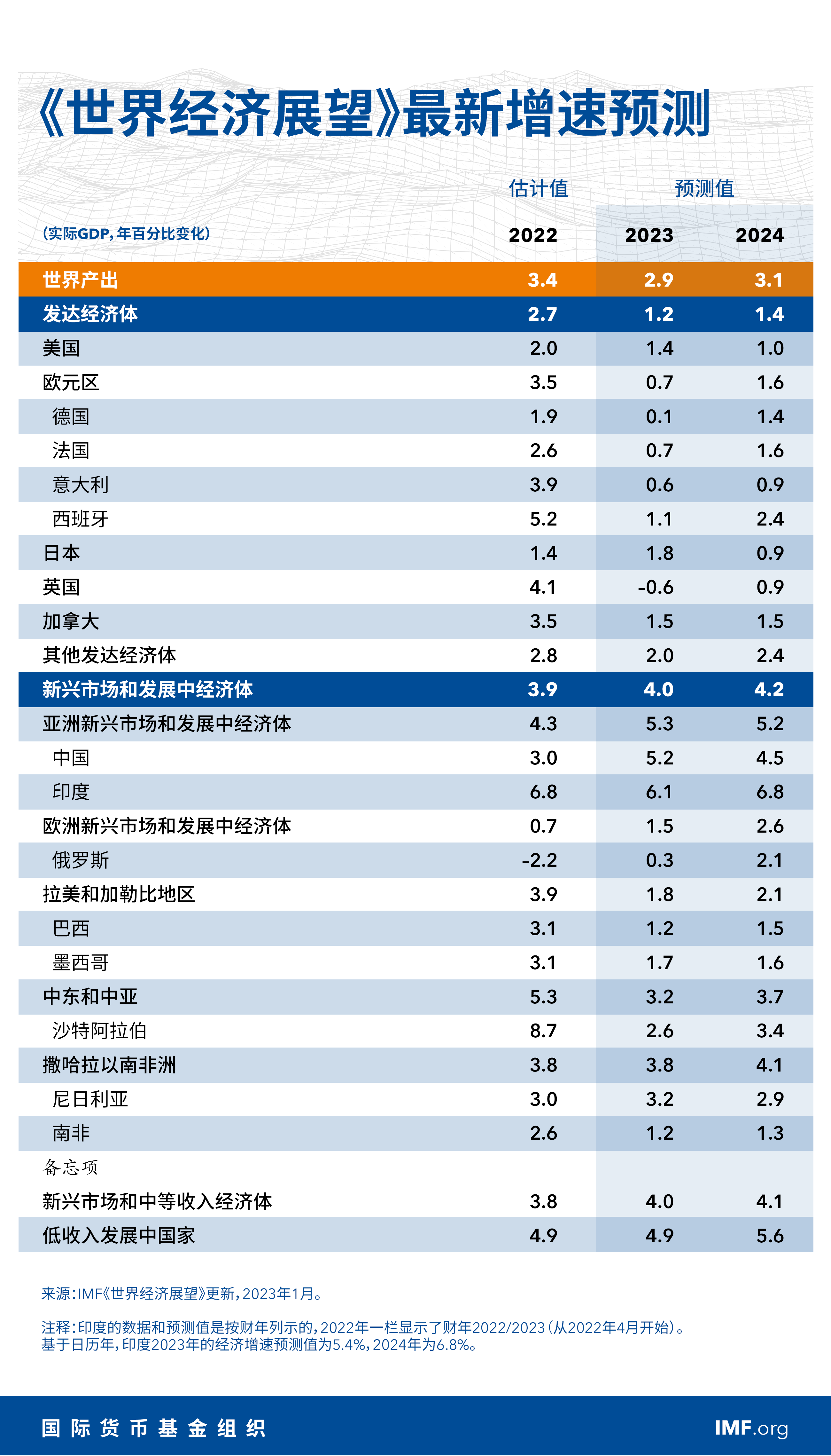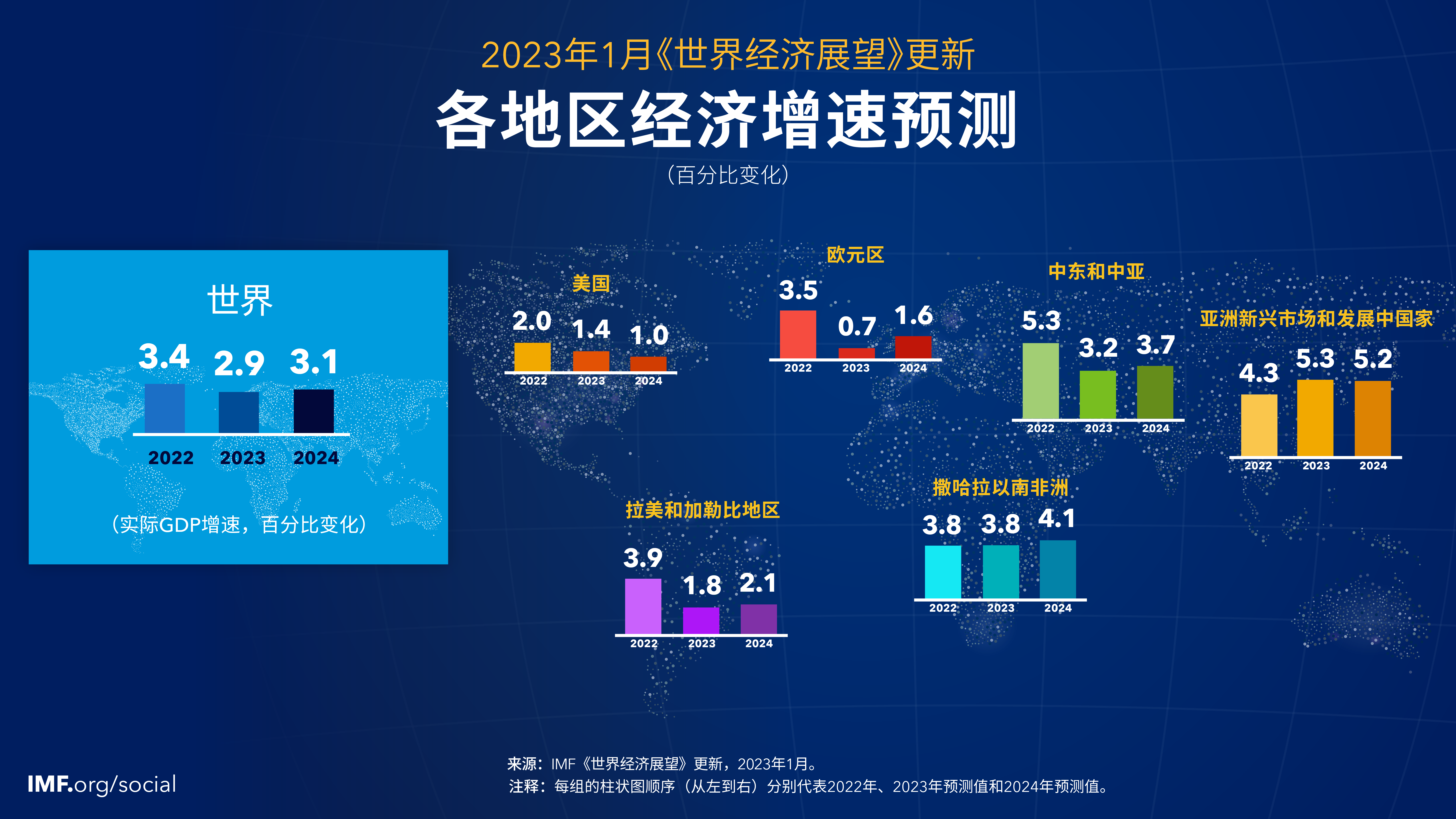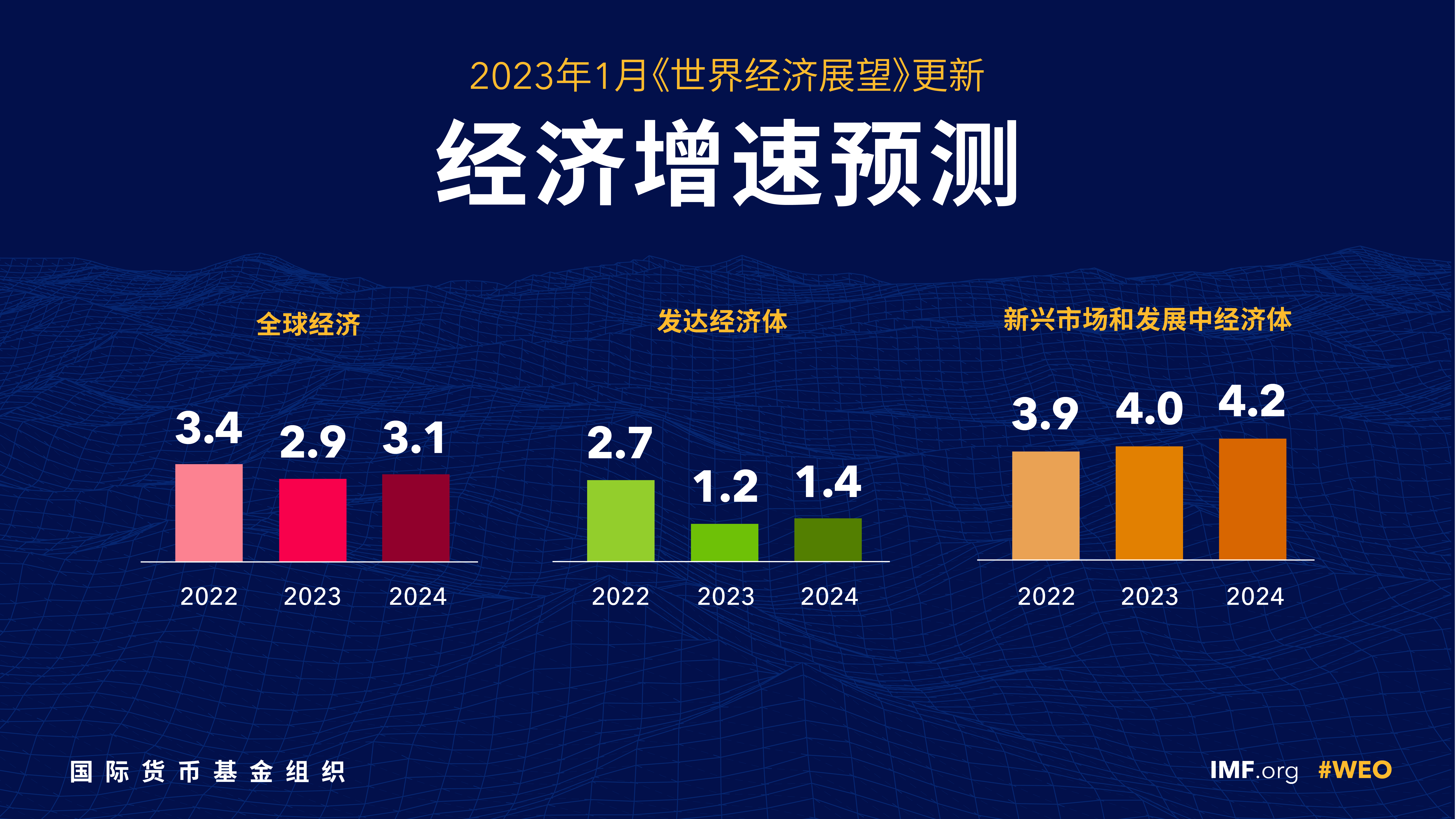 2022年的全球增长率估计约为3.4%,2023年预计将降至2.9%,2024年升至3.1%。2023年的预测值比2022年10月《世界经济展望》(WEO)的预测高0.2个百分点,但低于3.8%的历史平均水平(2000-2019年)。各国央行为抗击通胀采取的加息政策以及俄罗斯在乌克兰的战争继续对经济活动造成拖累。新冠疫情在中国的快速蔓延抑制了2022年的增长,但最近的重新开放为快于预期的复苏铺平了道路。全球通胀率预计将从2022年的8.8%降至2023年的6.6%和2024年的4.3%,但仍高于疫情之前(2017-2019年)约3.5%的水平。