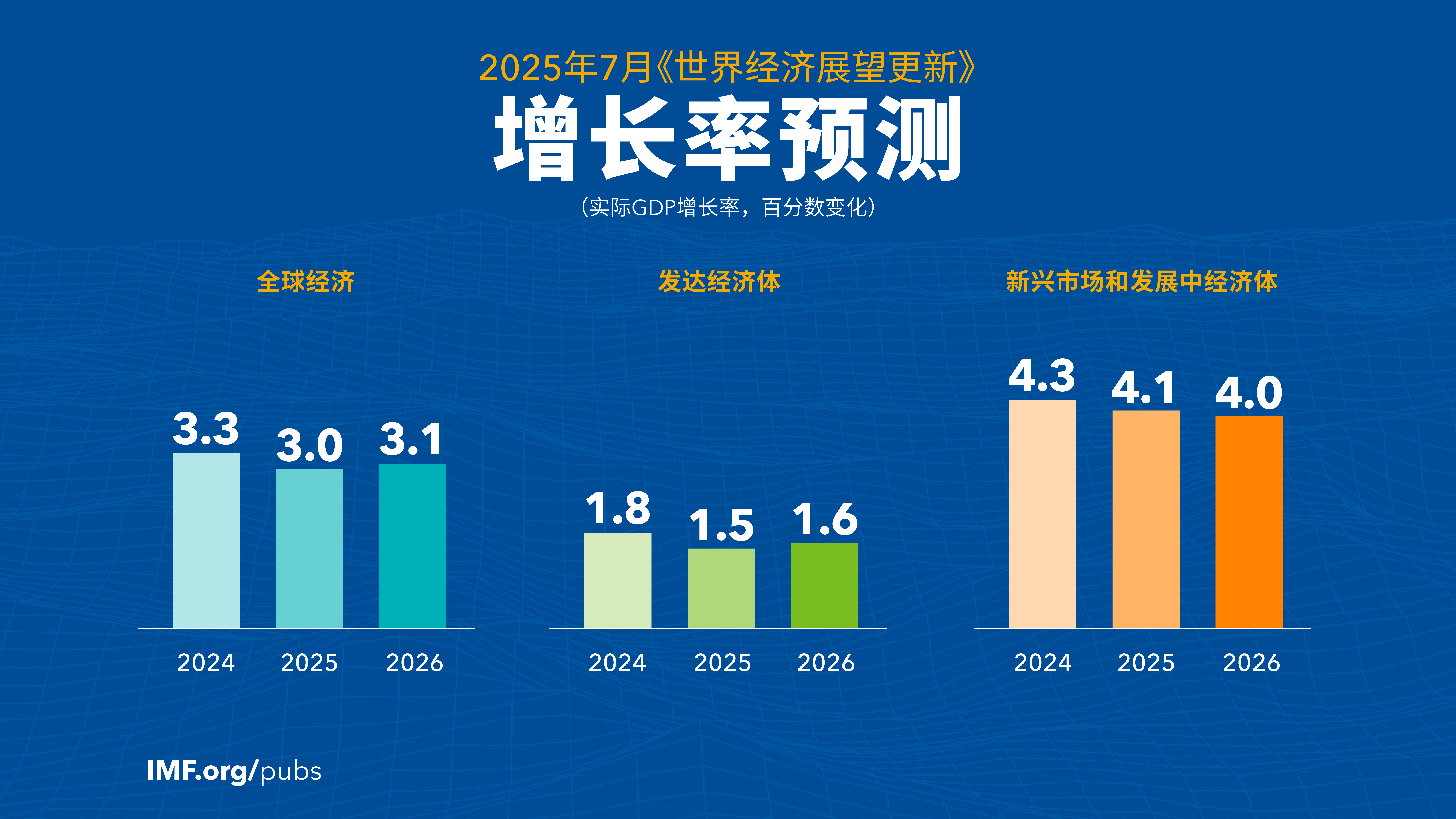 2025年和2026年,全球经济增速预计分别为3.0%和3.1%,较2025年4月《世界经济展望》的预测值有所上调。这反映了关税实施前的进出口前置效应、有效关税税率的下调、金融环境的改善以及部分主要经济体的财政扩张。全球通胀率预计会下降,但美国的通胀预计将保持在目标水平以上。潜在的更高关税、上升的不确定性以及地缘政治紧张局势带来的下行风险持续存在。恢复信心并提高可预见性和可持续性,仍是关键的政策优先事项。